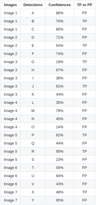 위의 예시를 보면 7장의 이미지에서 15개의 ground truth box(녹색 box)가 있으며, 24개의 bounding box(빨간색 box)가 있습니다. 각각의 bounding box는 알파벳을 통해 구분되며 confidence score를 가집니다. IoU 임계값이 0.3이라고 가정하면 왼쪽의 표와 같이 나타낼 수 있습니다.