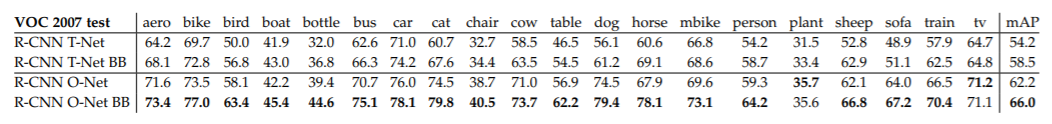 AP는 단일 객체에 대한 모델의 검출 성능을 측정합니다. 예를 들어 자전거, 새, 비행기에 대한 객체를 검출하는 모델이 있다면 각 객체별로 AP값이 도출되는 셈입니다. 모든 객체에 대한 모델의 종합적인 검출 성능을 측정하기 위해 모든 AP값의 평균을 매긴 mAP(mean Average Precision)을 사용합니다. 위의 도표는 R-CNN 논문에서 발췌한 성능 평가표로 각 객체별(aero, bike, bird...)로 AP값을 가지고 이를 평균낼 mAP가 별도록 존재하는 것을 확인할 수 있습니다.