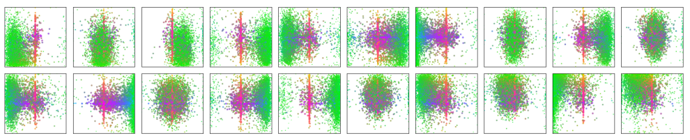 - Decoder output slot analysis 각 object query의 slot에 대한 분석을 진행한 결과 각 slot은 여러 모드로 특정 영역과 box 크기의 객체를 학습하는데 특화된 모습을 보였습니다. Fig 16 은 20개의 slot에 대한 시각화 결과로, 각 점은 예측한 bounding box의 center coordinate을 의미합니다. 초록색은 작은 box, 빨간색은 큰 수평 box, 파란색은 큰 수직 box에 해당합니다. 또한 거의 모든 slot이 COCO dataset에서 자주 등장하는 입력 이미지와 비슷한 크기의 box를 예측하는 모드를 가지고 있습니다.