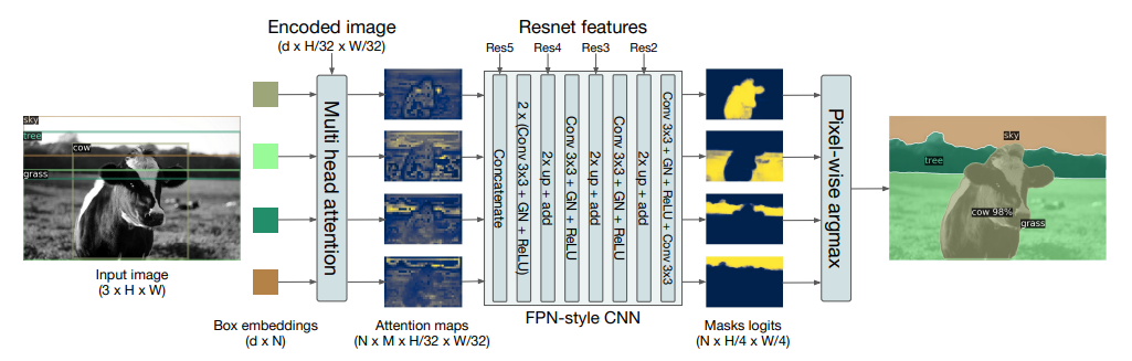 - DETR은 panoptic segmentation task에도 확장 가능함을 보였습니다. panoptic segmentation은 semantic- instance segmentation을 결합한 task입니다. 해당 task에서는 셀 수 있는 객체(차, 사람 등)을 Thing class, 셀 수 없는 객체(하늘, 길 등)을 Stuff class라고 합니다. Thing class에 대해서는 instance segmentation을, Stuff class에 대해서는 semantic segmentation을 수행합니다. panoptic segmentation에 대한 설명은 두더지 개발자 님의 블로그를 참고했습니다.