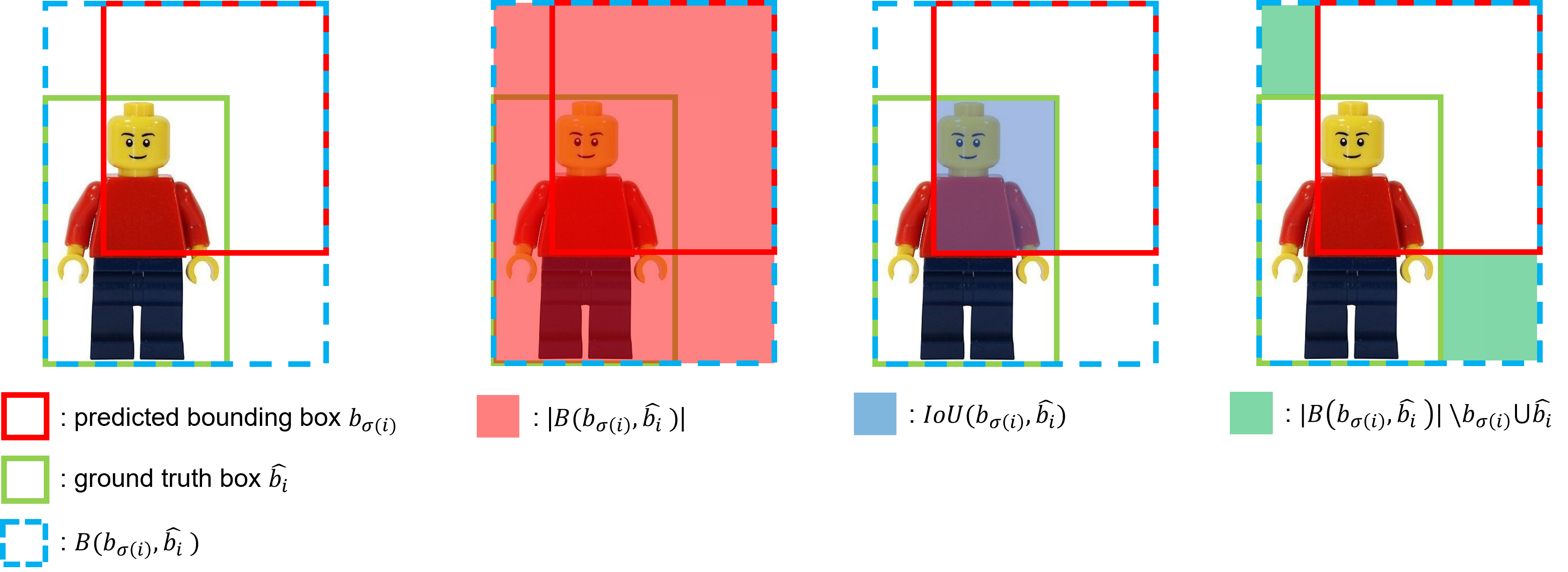 $GIoU = IoU(b_{\sigma(i)}, \hat{b}) - {{|B(b_{\sigma(i)}, \hat{b})| \backslash b_{\sigma(i)} \cup \hat{b_i}} \over {|B(b_{\sigma(i)}, \hat{b})|}}$