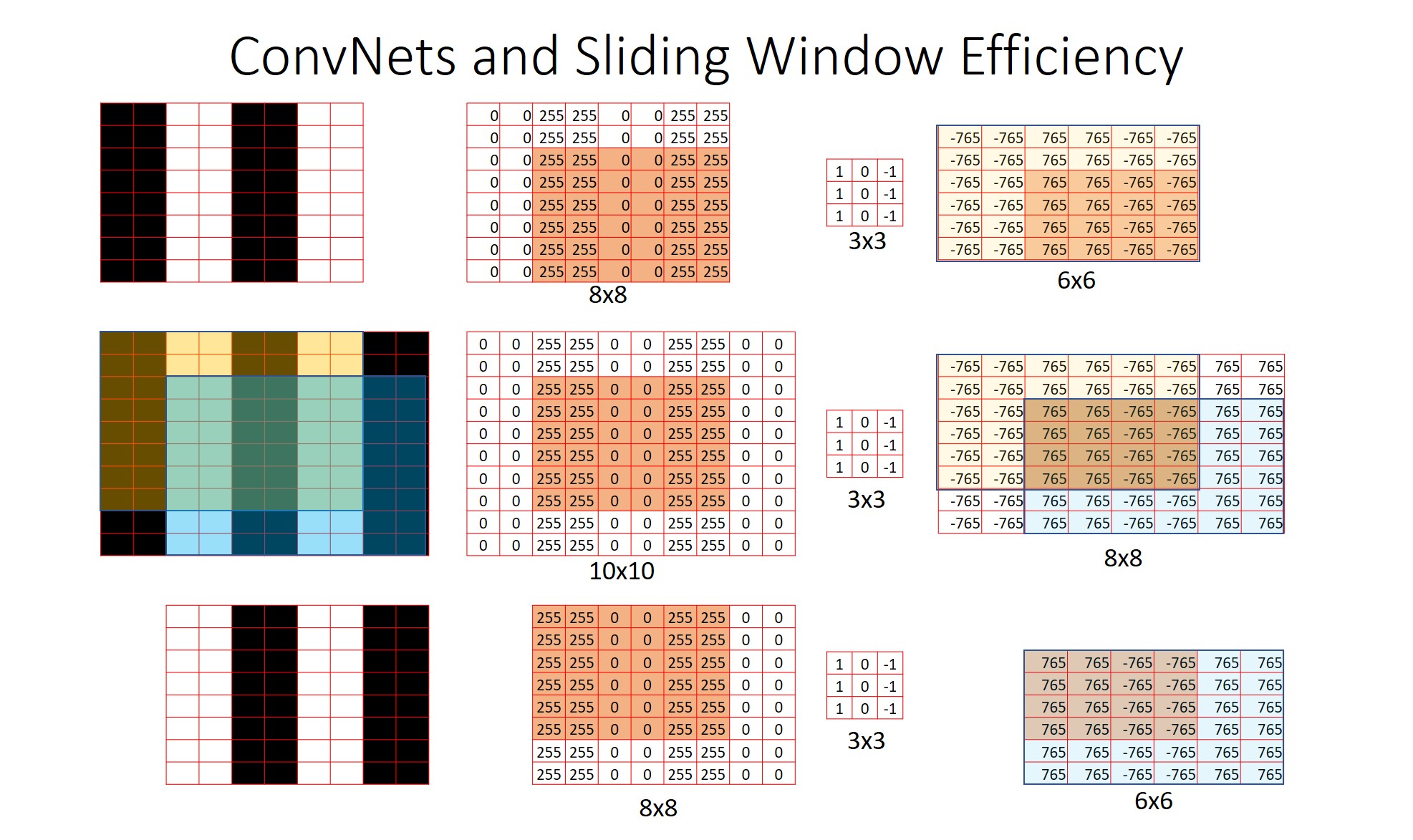 feature map에 conv filter를 적용하여 전체를 순회하는 과정은 sliding window와 유사합니다. 하지만 논문의 저자는 fc layer를 conv layer로 대체함으로써 Sliding window와 같은 효과를 보다 효율적으로 구현할 수 있었다고 말합니다. Conv layer에서 conv filter를 적용하는 과정에서 자연스레 겹치는 영역끼리 연산을 공유하기 때문입니다. 위의 그림을 보면 노란색 영역과 파란색 영역에 대하여 3x3 conv filter를 적용한 결과 겹치는 영역에 대한 정보가 같습니다. 이는 conv layer에서 겹치는 영역에 대한 중복된 연산을 피할 수 있음을 의미합니다. 반면에 Sliding window 방식을 통해 window 크기만큼 crop된 이미지 영역을 입력받으면, 각 window가 독립적이기 때문에 불필요한 연산이 발생할 수 있습니다.