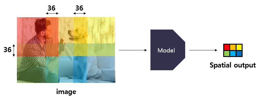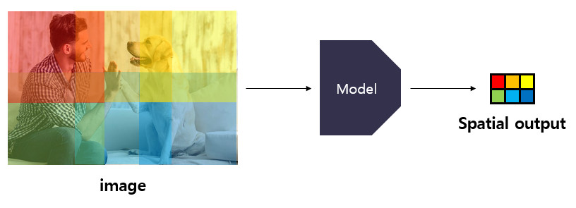 즉, 모델에 의한 산출된 spatial output의 한 요소는 원본 이미지 내 특정 receptive field에 대한 정보를 encode하고 있다고 볼 수 있습니다. 이러한 정보는 학습 방법에 따라 특정 class의 confidence score나 bounding box의 좌표값이 될 수 있습니다. 위의 그림에서 spatial output의 각 요소는 색깔에 맞는 이미지의 영역에 대한 정보를 함축하고 있다고 볼 수 있습니다.