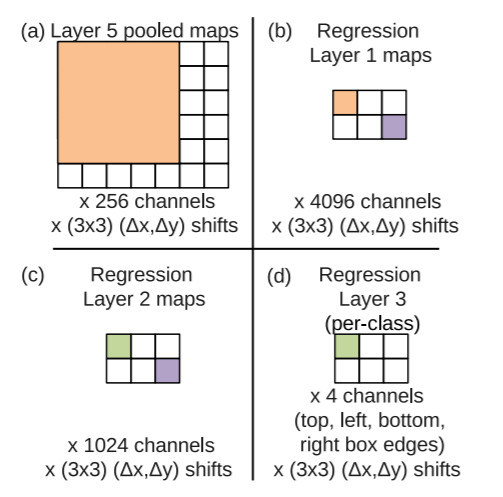Bounding box regressor를 통한 localization 과정 역시 Classifier의 Inference 과정과 크게 다르지 않습니다. 각 spatial map의 pixel 값은 각 class별, bounding box의 x1, y1, x2, y2 좌표를 나타냅니다. 따라서 spatial output의 channel 수는 4 x C(=class)입니다. 위의 그림은 논문에 첨부된 그림으로, feature map이 각 layer를 거침에 따라 변화되는 크기를 잘 보여줍니다.