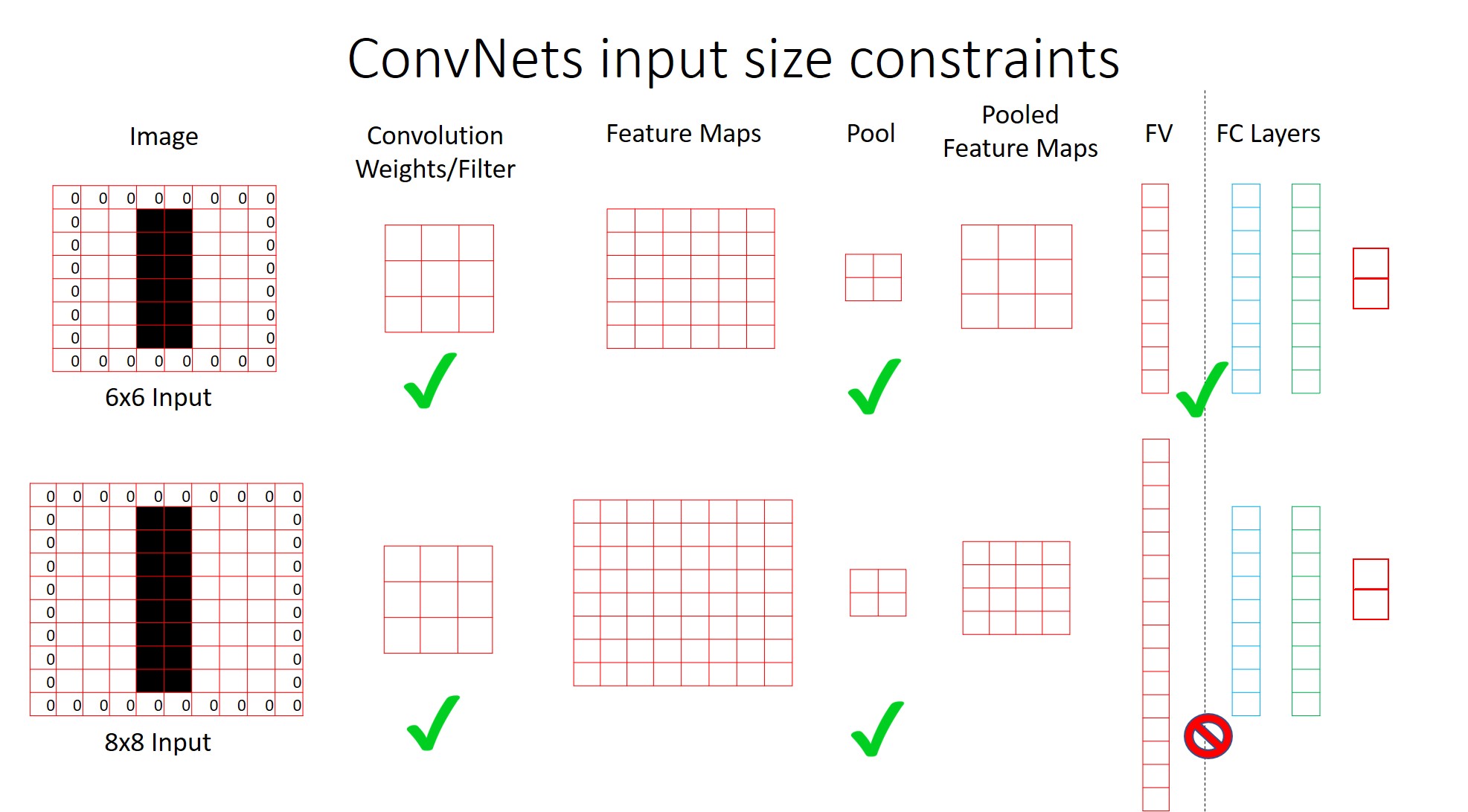 먼저 Overfeat 모델은 detection시, multi-scale 이미지를 입력받습니다. detection 모델이 하나의 이미지를 다양한 크기로 입력받으면 이미지 내 존재하는 다양한 크기의 객체를 보다 쉽게 포착하는 것이 가능해집니다. 실제로 이미지의 scale이 커지면 더 작은 객체를 탐지하는 것이 가능합니다. 이러한 점은 기존 CNN 모델이 고정된 크기의 이미지(single-scale)를 입력받는다는 점에서 차이를 보입니다. 가령 AlexNet 모델은 227x227, VGG 모델은 224x224 크기의 이미지를 입력으로 받습니다. Detection 모델인 R-CNN 모델 역시 Selective search로 추출한 region proposal을 fine tuned된 AlexNet에 입력하기 위해 227x227 크기로 warp 시킵니다. 이처럼 CNN 모델이 고정된 크기의 이미지를 입력받는 이유는 fc layer(fully connected layer)가 고정된 크기의 feature vector를 입력받기 때문입니다.