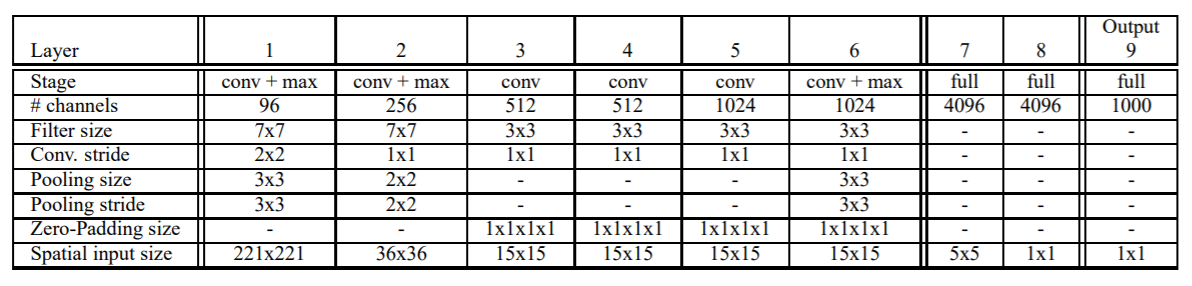 Overfeat 모델은 AlexNet 모델과 유사하지만 contrast normalization을 사용하지 않으며, pooling 시 겹치는 영역이 없도록(non-overlapping)한 점, 그리고 더 작은 stride(4 대신 2)를 적용하여 1,2번째 layer의 feature map이 더 크다는 차이가 있습니다. ImageNet 데이터를 통해 1000개의 class를 예측하도록 학습시킵니다. 논문의 저자는 모델 설계 방식에 따라 더 빠르게 동작하는 fast mode와, 정확도가 더 높은 accurate mode를 발표합니다. 모델의 구조는 위와 같습니다.