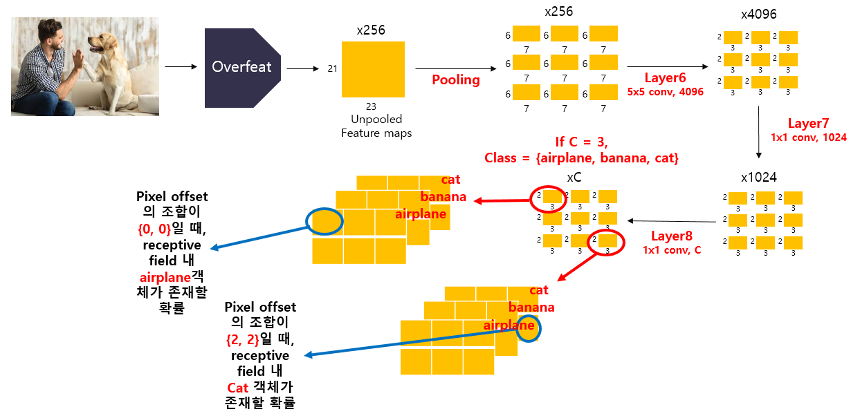 위의 그림은 scale 2 이미지(281x317)가 입력되었을 때 Classifier가 동작하는 과정을 보여주고 있습니다(직접 그렸습니다!). 여기서 최종spatial output의 각 pixel이 가지는 의미를 직관적으로 이해하는 것이 중요하다고 생각합니다. 위의 그림을 참고하면 spatial output의 각 pixel 값이 pooling 시 어떤 pixel offset 조합인지(원본 이미지의 어떤 receptive field에 해당), 어떤 class를 예측하는지, 하는지를 파악하는 데 도움이 될 것 같습니다. Classifier는 이처럼 spatial output을 통해 원본 이미지의 특정 receptive field에 대한 confidence score와 class를 출력합니다.