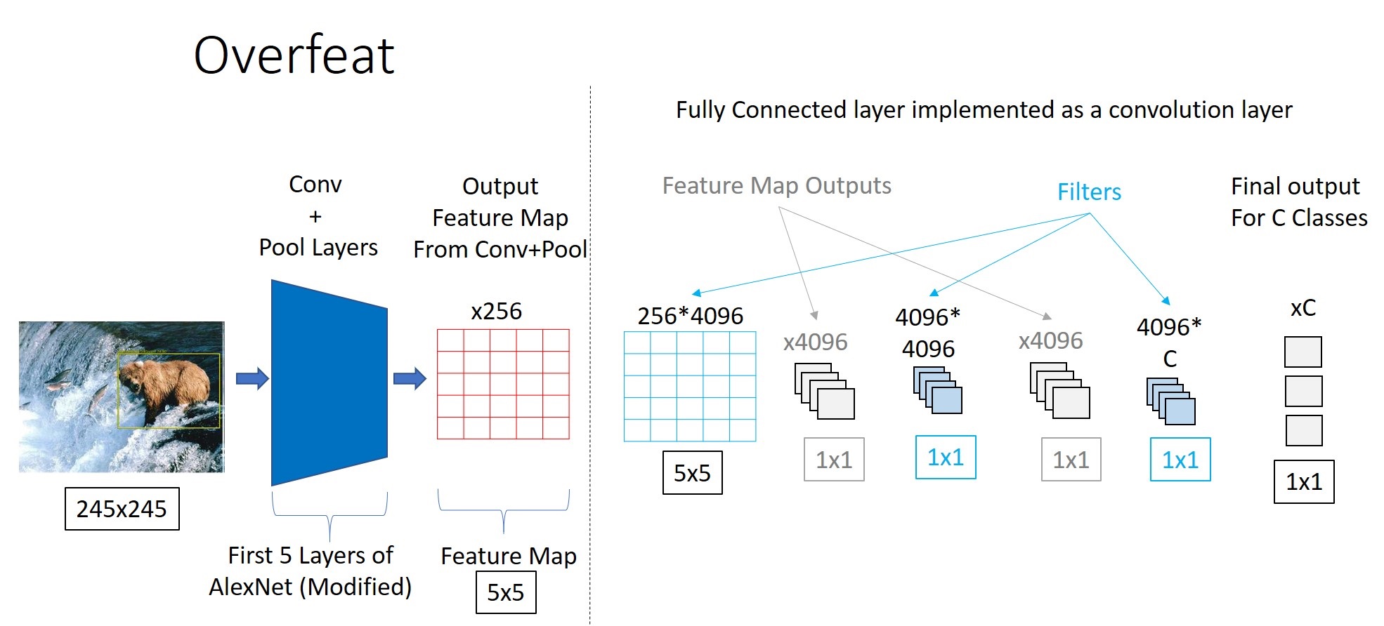 이미지의 scale이 변하면 fc layer에 입력되는 feature vector의 크기 역시 변하기 때문에, 일반적인 CNN 모델은 다양한 크기의 이미지를 입력으로 받을 수 없습니다. 하지만 fc layer를 conv layer로 대체하면 다양한 크기의 이미지를 입력받을 수 있습니다. Overfeat 모델은 이러한 점을 착안하여 모델의 fc layer를 conv layer로 대체합니다. 하지만 이로 인해 output은 이미지 scale에 따라 가변적인 크기를 가지게 됩니다. 이처럼 scale에 따라 다른 크기를 가진 output map은 object detection task에서 어떤 의미를 가질까요?